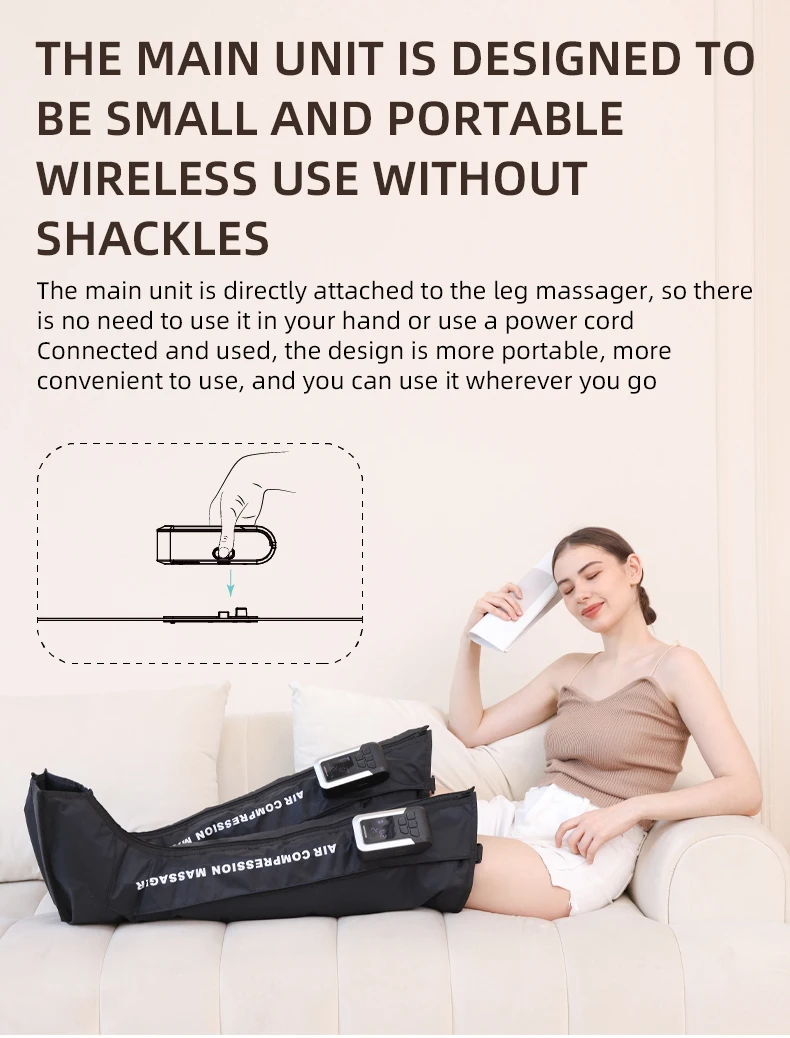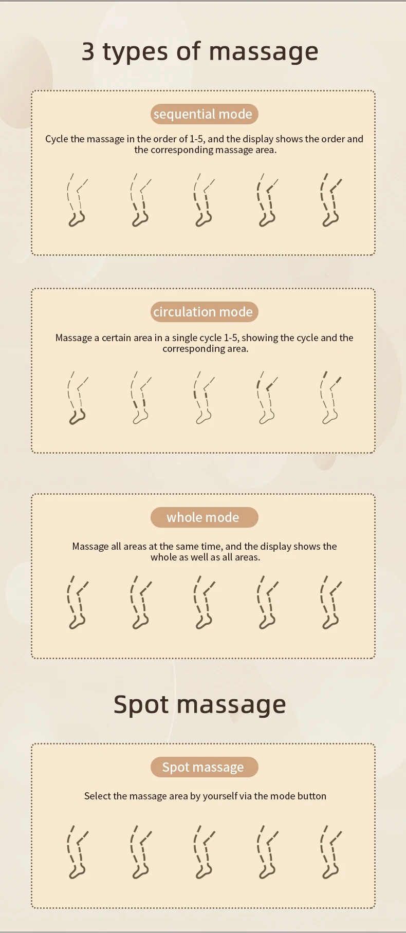 Five groups of airbags evenly distributed throughout the legs, from the soles of the feet to the thighs massage, more effective lower extremity deposits of blood to the upper body drainage, more effective relief of fatigue