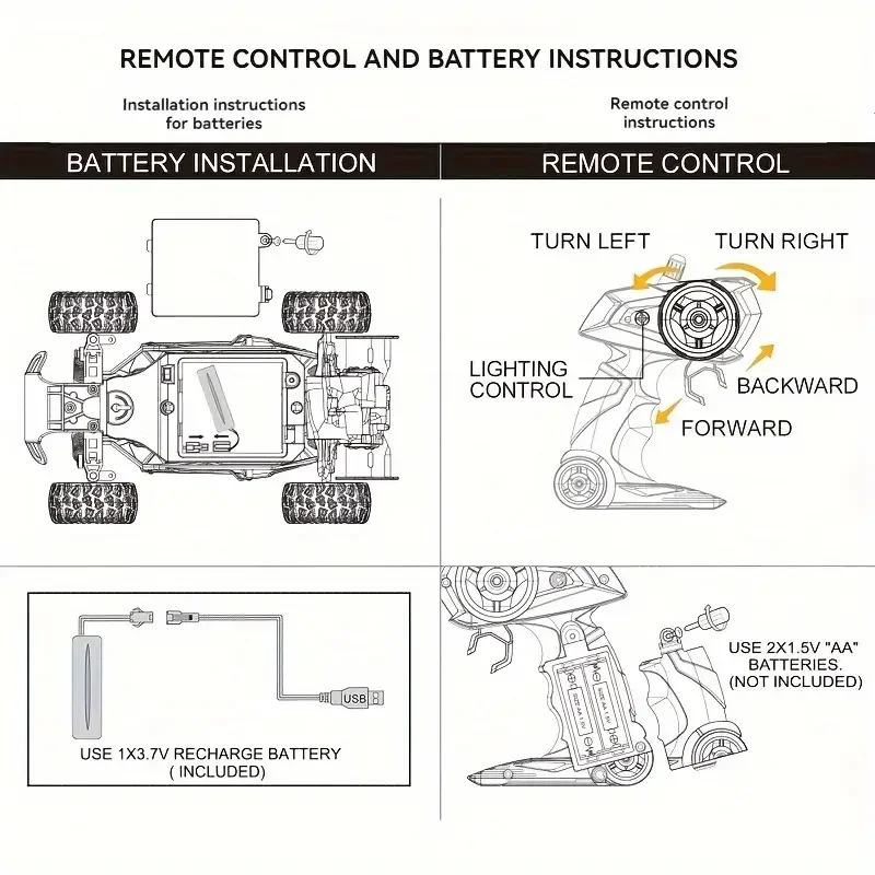 – Long-Lasting Battery & Rapid Recharge — Powered by a high-capacity 3.7V 500mAh rechargeable lithium-ion battery, this RC monster truck delivers up to 20 minutes of exhilarating high-speed driving at speeds reaching 20 km/h. The quick-charging technology allows a full recharge within approximately 60 minutes, minimizing downtime and maximizing outdoor entertainment. Ideal for extended racing sessions, stunt performances, and outdoor exploration.