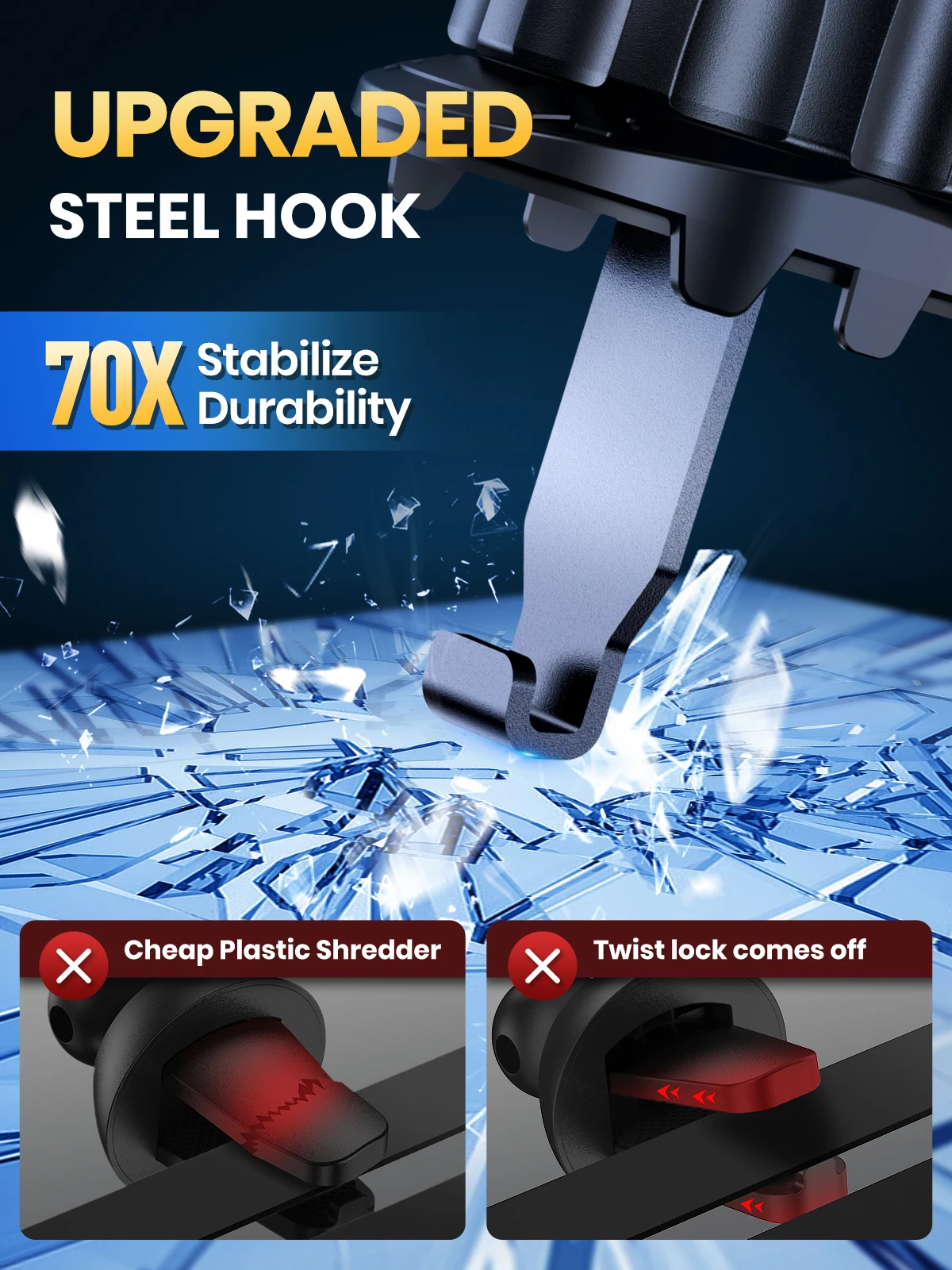 👍UPGRADE HOOK CLIP:The "hook shape" of this car phone holder mount creates "three gripping places" that firmly grasp the air outlet blades. Even when driving on uneven roads, it won't come off. The car mobile phone holder was created for innovation and usefulness, and it addresses the market's common issue of easy slipping off.