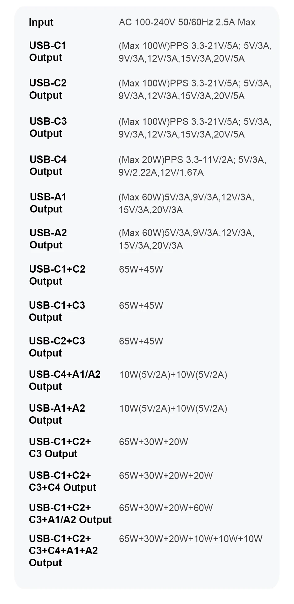 USB-C1/C2/C3 Output: (100W Max)PPS 3.3-21V/5A; 5V/3A,9V/3A,12V/3A,15V/3A,20V/5A