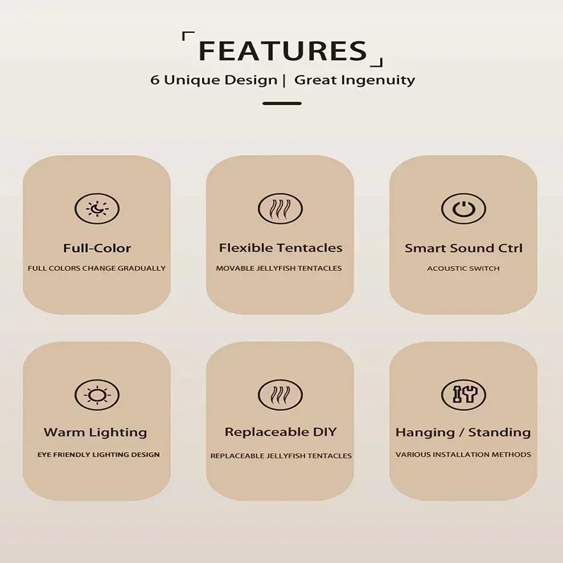 【Simulation dynamic tentacles】: The LED Smart Jellyfish Night Light features nine rotatable tentacles that mimic the natural movement of a jellyfish, captivating onlookers with its graceful and hypnotic dance, perfect for inspiring imagination and wonder.