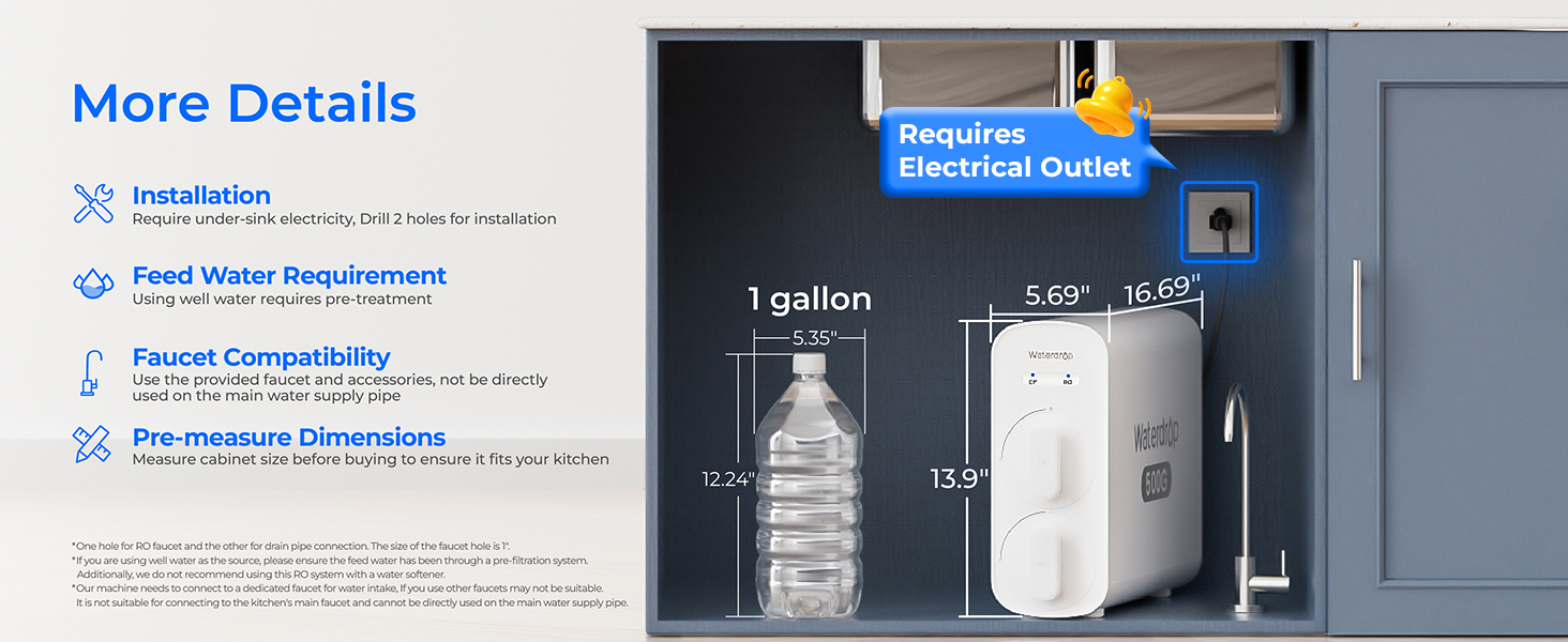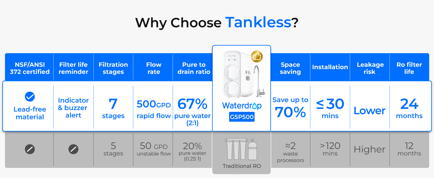 • 𝐒𝐩𝐚𝐜𝐞-𝐒𝐚𝐯𝐢𝐧𝐠 𝐓𝐚𝐧𝐤𝐥𝐞𝐬𝐬 𝐃𝐞𝐬𝐢𝐠𝐧:Say goodbye to tank RO filtration systems. The tankless RO system's innovative tankless design saves up to 70% more kitchen space, making it perfect for modern homes. Its sleek and compact build effortlessly integrates into any kitchen setup