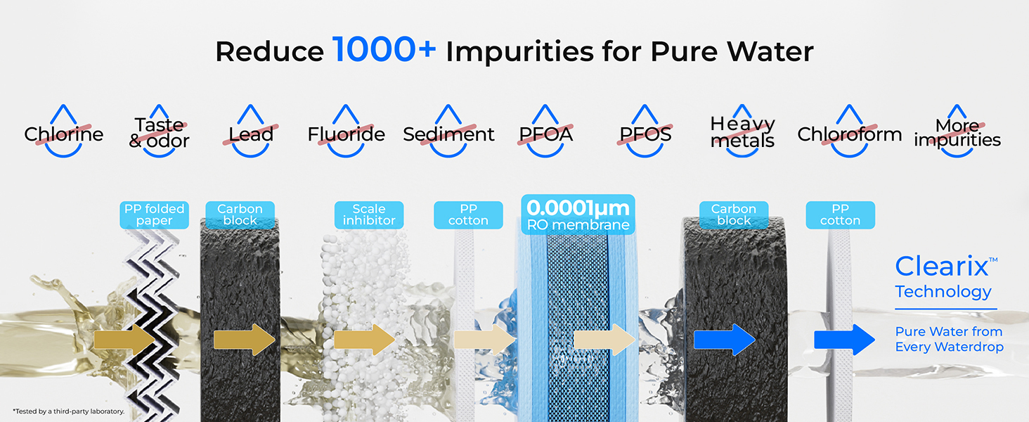 • 𝐀𝐝𝐯𝐚𝐧𝐜𝐞𝐝 𝟕-𝐒𝐭𝐚𝐠𝐞 𝐅𝐢𝐥𝐭𝐫𝐚𝐭𝐢𝐨𝐧:The reverse osmosis system features a precise 7-stage filtration system that reduces harmful contaminants, including PFOA, PFOS, chlorine, lead, fluoride, heavy metals, and more impurities. This ensures every tip of water is pure, safe, and free from bad taste and odor, delivering pure drinking experience