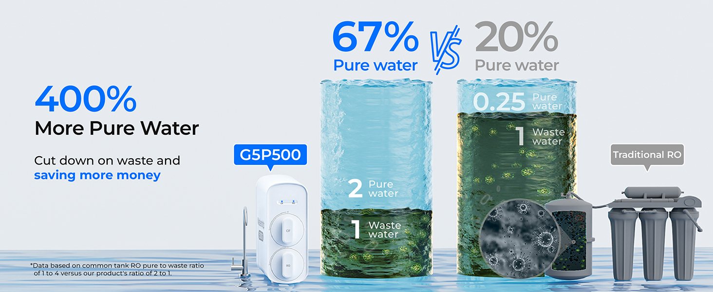 • 𝟎.𝟎𝟎𝟎𝟏μ𝐦 𝐑𝐎 𝐌𝐞𝐦𝐛𝐫𝐚𝐧𝐞:Equipped with a high-precision 0.0001μm RO membrane, the G5P500 effectively filters out impurities larger than 0.0001μm, ensuring unparalleled water purity. This advanced technology guarantees that your water is not only clean but also refreshingly tasty