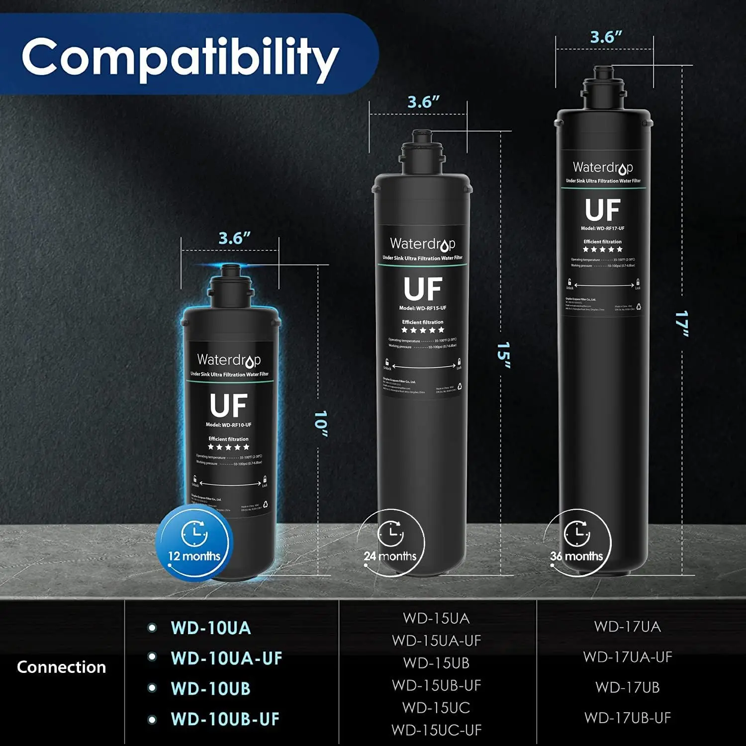 【Compatible model】Compatible Replacement Filter for Waterdrop 10UA under sink water filter system (WD-10UA), 10UA-UF under sink water filter system (WD-10UA-UF), 10UB under sink water filter system (WD-10UB), 10UB-UF under sink water filter system (WD-10UB-UF). This undersink filter brings you purified water from your original faucet or your dedicated faucet. Get easy access to clean, safe, and healthy purified water with Waterdrop!