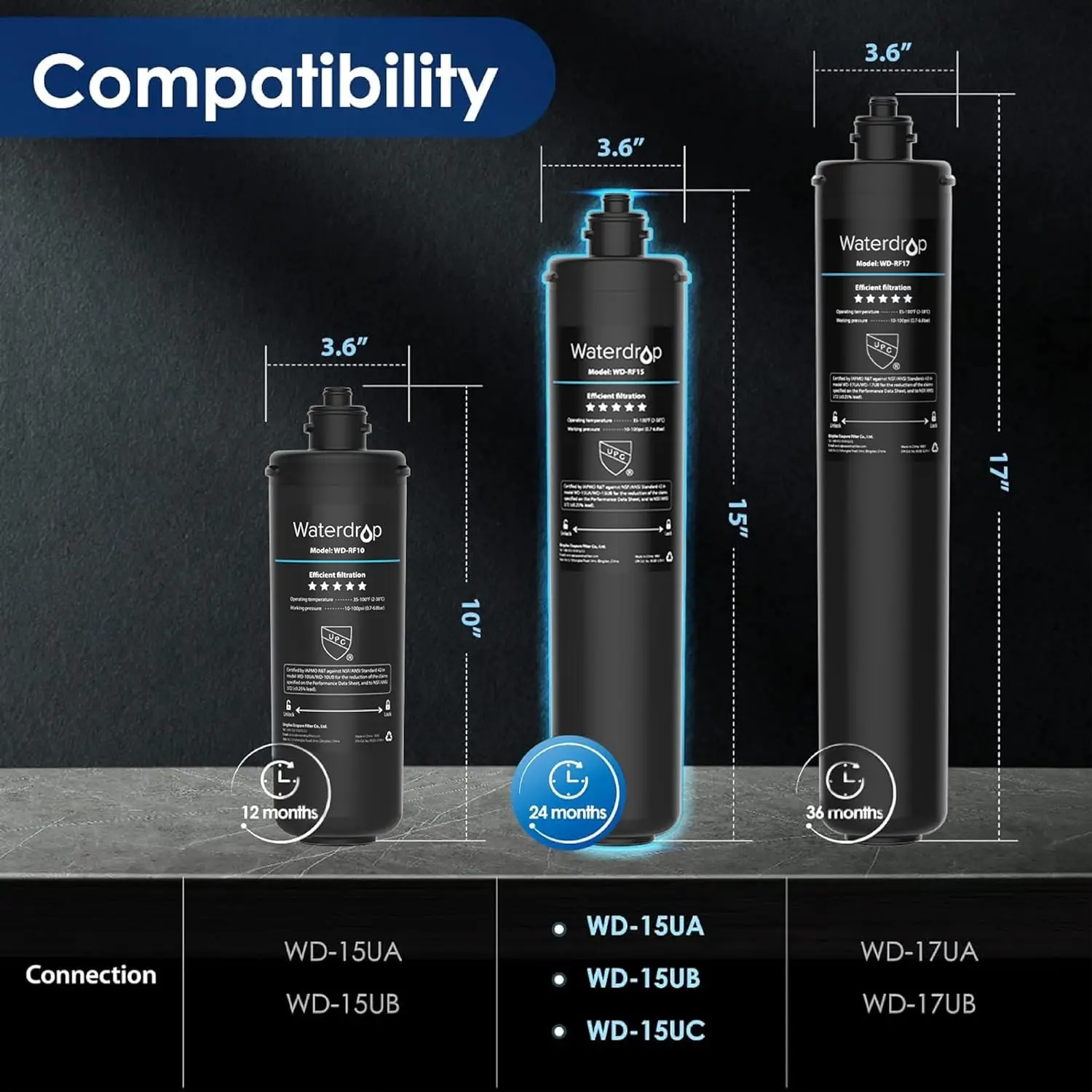 【Compatible model】Compatible Replacement Filter for Waterdrop 15UA under sink water filter system (WD-15UA), 15UB under sink water filter system (WD-15UB). Compatible with all three methods of connection, this undersink filter brings you purified water from your original faucet, your dedicated faucet, or your refrigerator. Get easy access to clean, safe, and healthy purified water with Waterdrop!