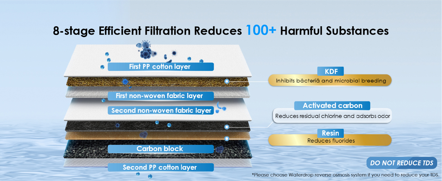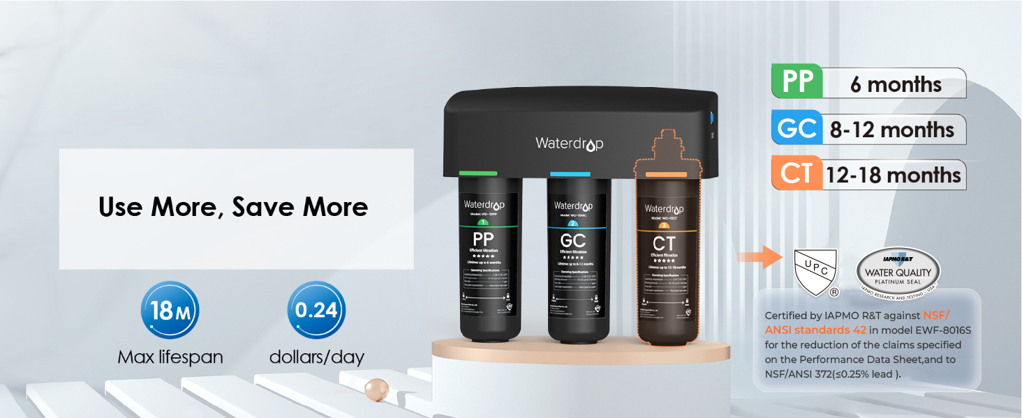 This under sink water filter system comes with 3 filters and can realize 8-stage deep filtration to reduce PFAS, PFOA/PFOS, residual chlorine, fluorides, heavy metals, silt, rust, cyst, etc. Its KDF materials can effectively reduce heavy metals. Its resin reduces fluorides. The CT filter has passed IAPMO certification to reduce residual chlorine and improve taste, thereby ensuring every drop is pure and healthy.