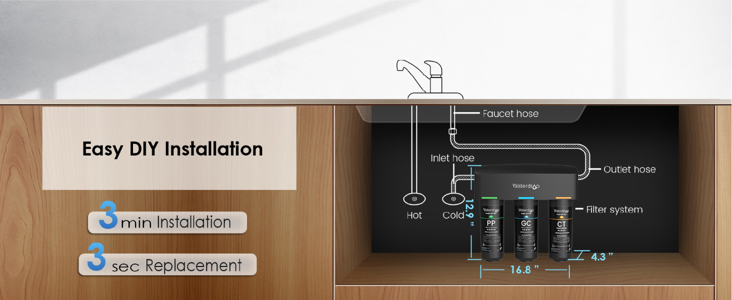 This under sink water filter system works perfectly with 3/8” and 1/2” cold water tubes. The under sink water filtration system is a simple DIY. With innovative push-to-connect fittings, the installation of the under sink water filter system takes less than 3 minutes. In addition, the twist-and-lock design lets you replace each filter in just 3 seconds.