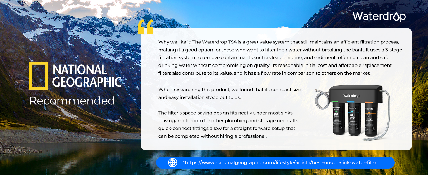 The Waterdrop TSA is an under sink water filter recommended by National Geographic. It is compact and easy to install. The filter's space-saving design fits neatly under most sinks, leaving ample room for other plumbing and storage needs. Its quick-connect fittings allow for a straightforward setup that can be completed without hiring a professional.