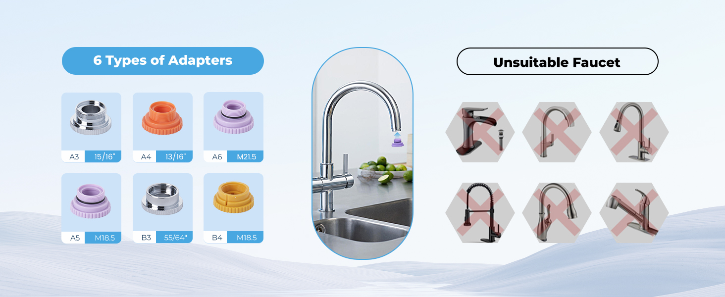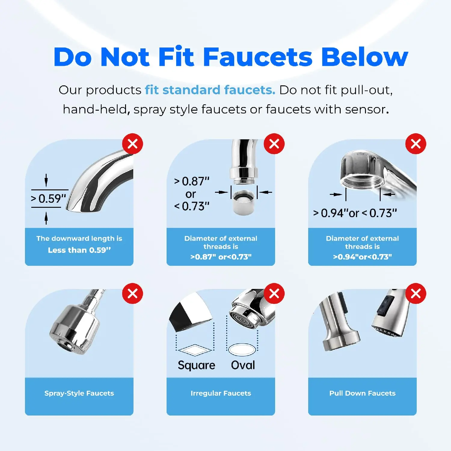 𝐈𝐦𝐩𝐨𝐫𝐭𝐚𝐧𝐭 𝐧𝐨𝐭𝐞: 𝐖𝐨𝐫𝐤𝐬 𝐰𝐢𝐭𝐡 𝐬𝐭𝐚𝐧𝐝𝐚𝐫𝐝 𝐟𝐚𝐮𝐜𝐞𝐭𝐬. Does not fit pull-out, hand-held, spray style faucets or faucets with sensor. Please verify if our product suits your faucet before purchase per the detailed instructions in product pictures. Operating Temperature: 41-122℉/ 5-50℃; Operating Working Pressure: 15-100 psi / 100-689 kPa.