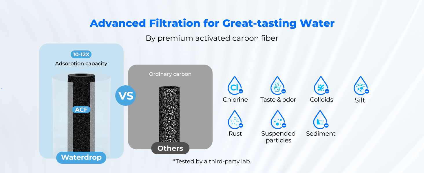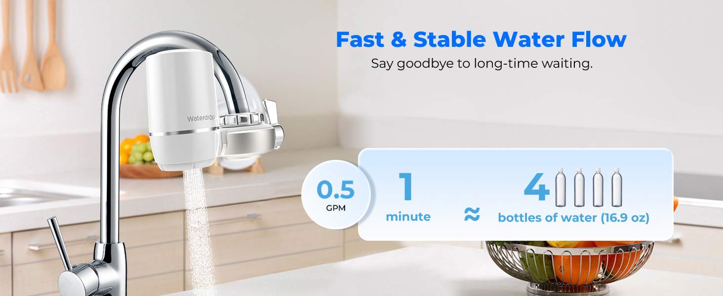Lead reduction: The innovative ACF material features great and fast filtration. You will fill up 4 water bottles (16.9 oz for each) in 1 minute. Upgraded filtration technology to reduce lead chlorine, offering safer and refreshing water for you and your family.(Tested by third party laboratory)