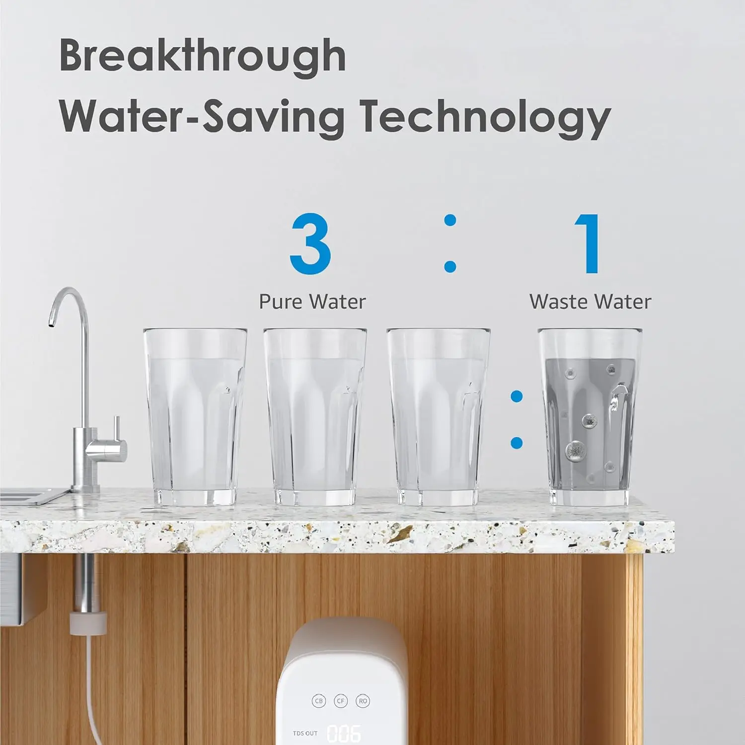 【Breakthrough water-saving technology】The reverse osmosis filter with enlarged membrane area offers a 3:1 drain ratio, i.e., 3 cups of pure water for every 1 cup of water that goes to the drain.