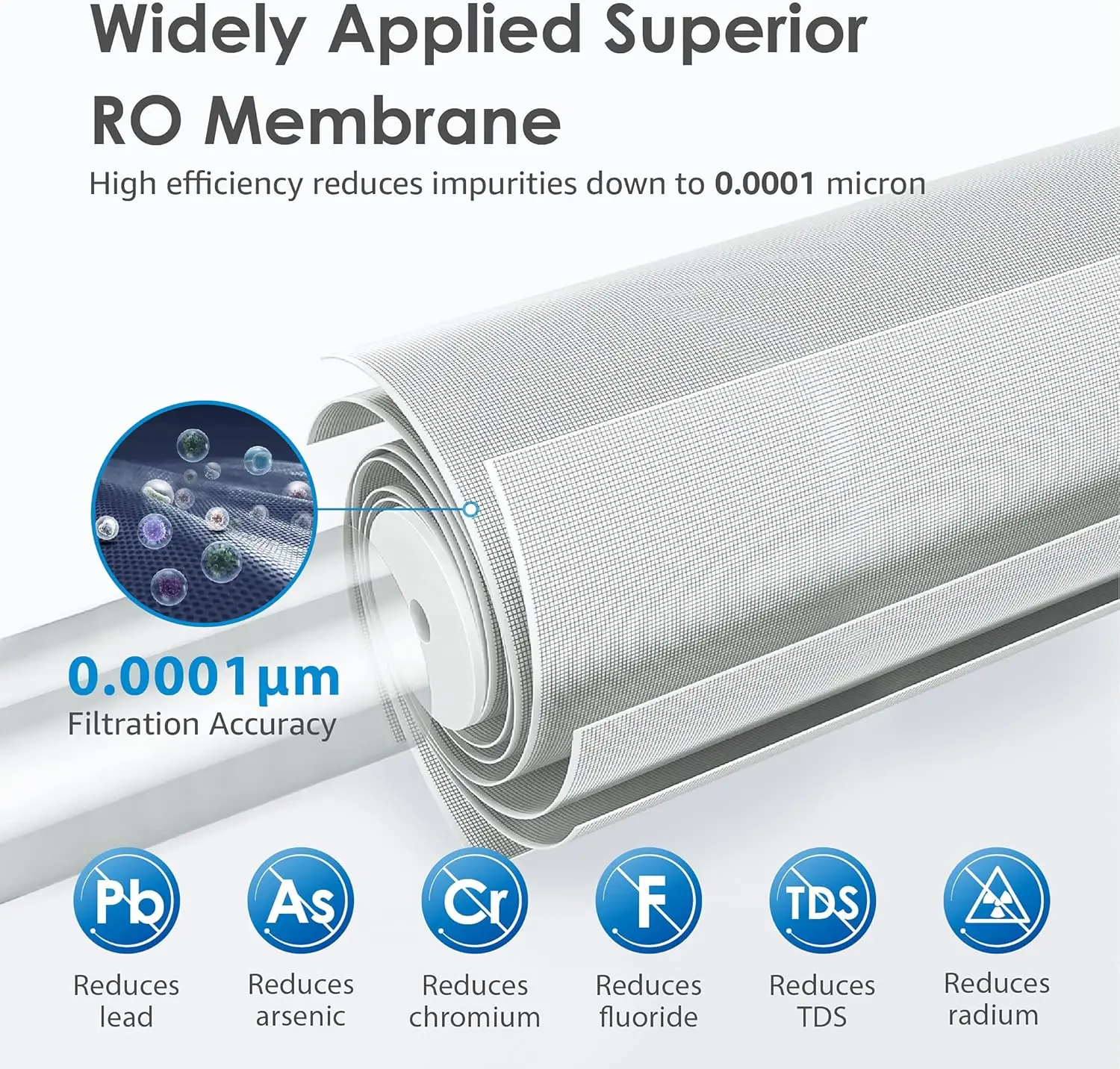 【Highly precise filtration】 The filtration precision of our RO membrane is up to 0.0001 micron. It effectively eliminates chlorine, heavy metals, organic, colloids, radium, radioactive substances and other harmful substances. It also reduces TDS in your drinking water, ensuring you don’t miss the pure essence of water.